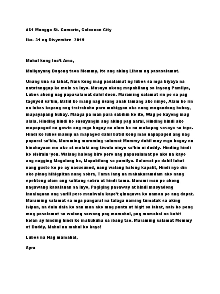 Liham Pasasalamat Docx Liham Para Kay Mama At Papa Mahal Kong Mga Magulang Una Sa Lahat Nais Ko Kayong Pasalamatan Sa Lahat Ng Mabuting Bagay Na Course Hero